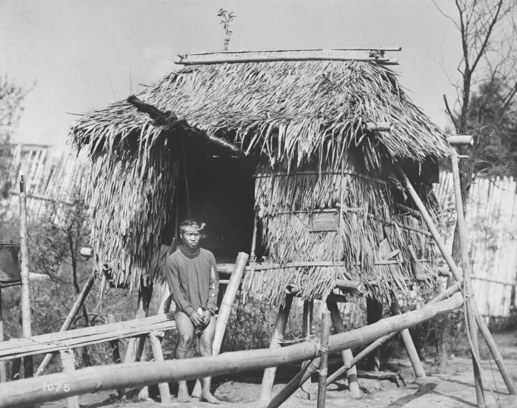 One Mangyan stands outside his hut, who was abducted from his village in Mindoro without knowledge of the destination. Written on the plaque outside is “Kario, Sinhigan, St. Louis,” the names of its two residents. The Mangyans lived alongside the Aeta in the Negrito Village during the 1904 World’s Fair.